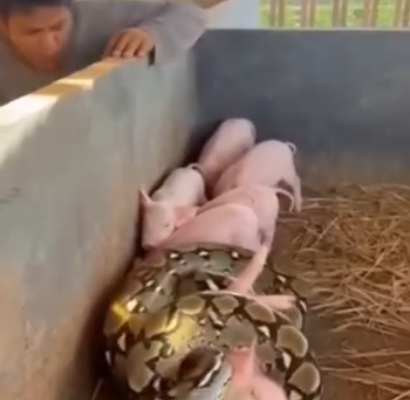 A shocking video is making waves online after a massive python was found coiled tightly around helpless piglets inside a farm enclosure. The sight of the snake, with its thick body wrapped around the piglets, has left many viewers in disbelief. The scene seems almost surreal, with the snake calmly resting as the tiny pigs squirm beneath its hold.