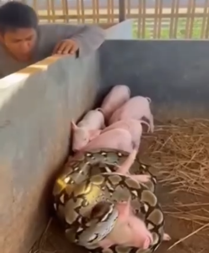 As the piglets squeal and struggle, tension builds in the footage, keeping viewers on edge. The helpless animals attempt to break free from the python’s grip, but the large snake holds firm. The sight of their distress is heart-wrenching, and many are left wondering what will happen next, hoping for an intervention.